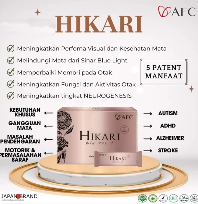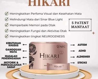 Hikari adalah superfood vegan AFC dengan patent klinis untuk kesehatan Mata & Otak. Cocok untuk usia anak – lansia dengan keluhan adhd, alzheimer, gangguan mata.