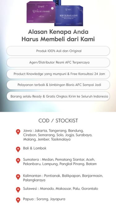 Mungkin yang Anda butuhkan bukan lagi obat yang hanya menunda gejala, tapi solusi yang bekerja dari dalam.Kini saatnya beralih ke Solusi Sehat dengan produk-produk premium dari AFC Japan.