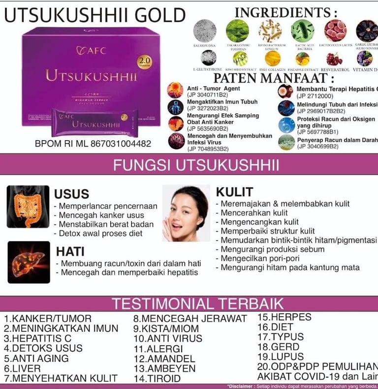 Utsukushhii Gold merupakan Suplemen Salmon DNA dari Jepang serta 12 Bahan Aktif Powerful yang memiliki banyak Patent manfaat bagi tubuh.